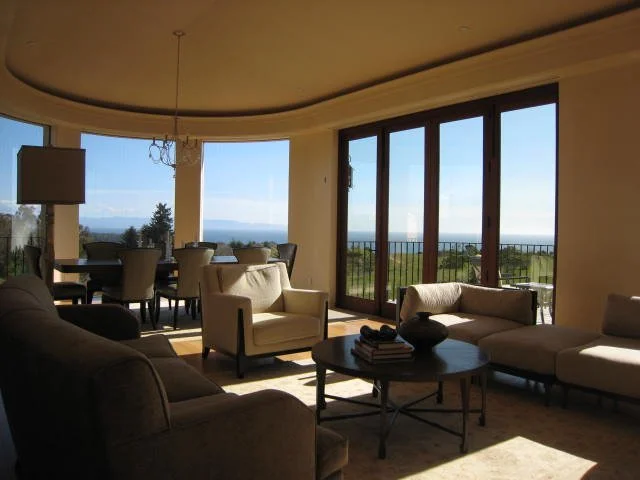 This project presented a challenge with its irregularly shaped flag lot. By putting the garage underground, we used the "pole" as a descending driveway and an elevated walkway to lead to the narrow though charming front elevation and entry plaza. Inside, one is drawn to a two-story interior courtyard with a curving stair and a fountain that invites one up to the great room at the end of the house, where doors fold back onto a large balcony, with a sweeping view of the bay. Off the atrium is a two-story mahogany library and another ladder up to a telescope structure and a twelve-foot-diameter observatory skylight. This project also has a wine tasting room and a media room, both faced in stone.